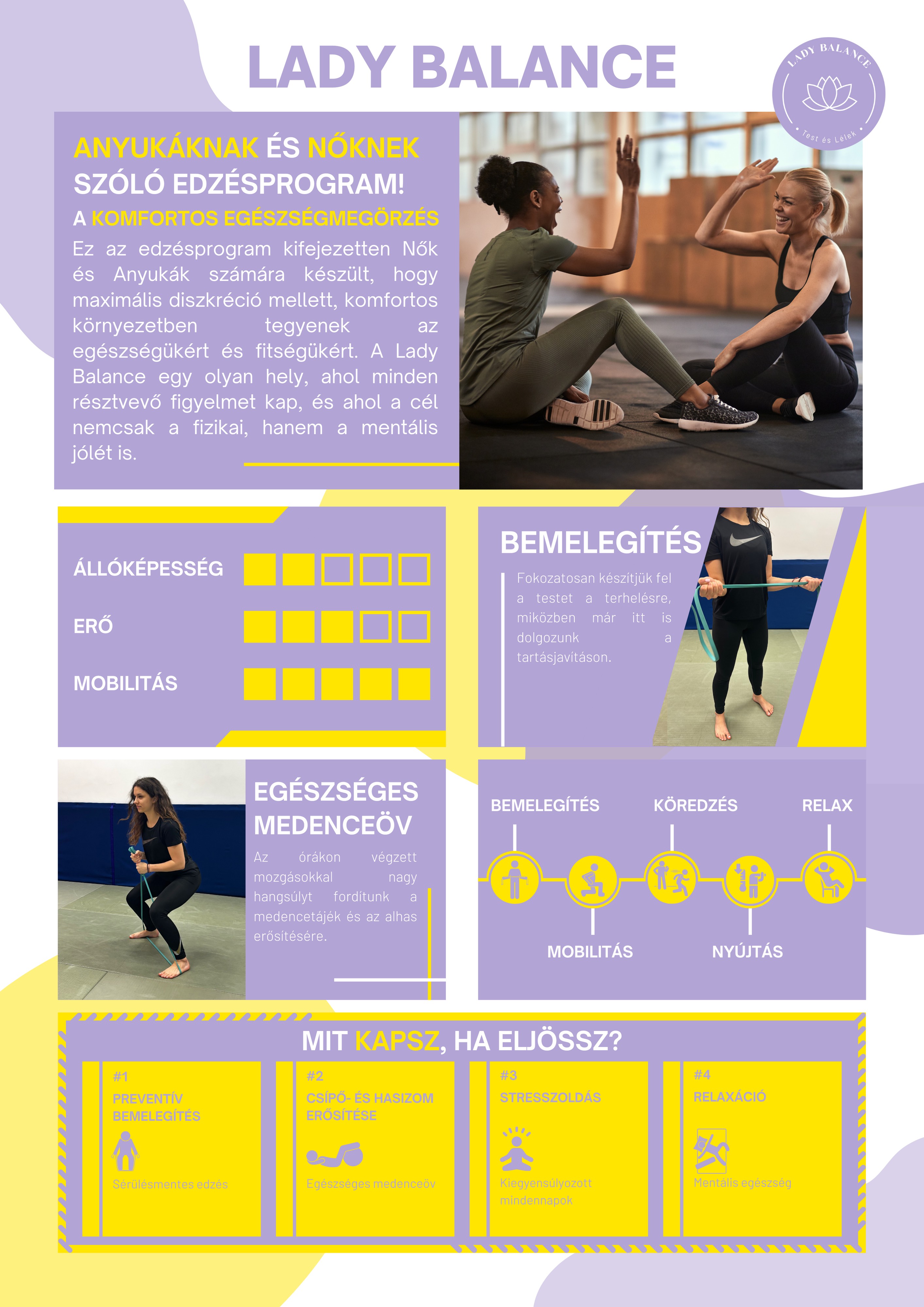 A LadyBalance kifejezetten a női test igényeire szabott, modern szemléletű mozgásprogram, amely a csípőmobilitás fejlesztésére, a helyes testtartás kialakítására és a funkcionális mozgásminták javítására összpontosít.
